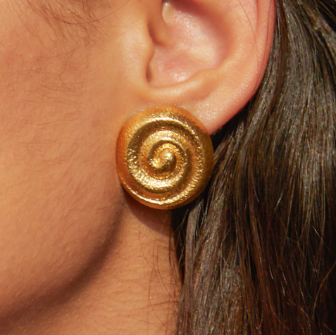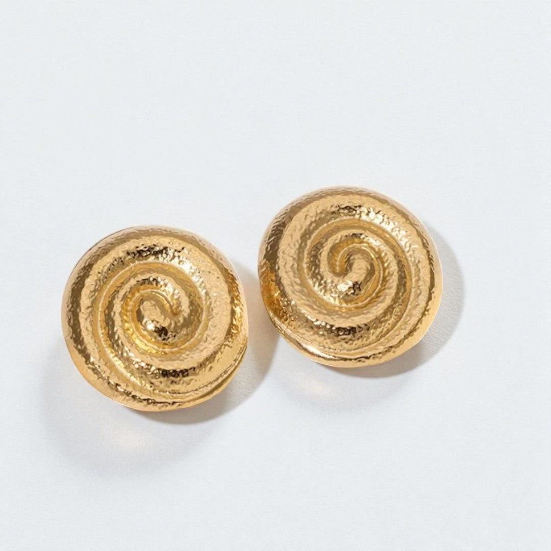 Orecchini a spirale in acciaio inox 316L placcati oro 18K. La texture martellata dona luce e movimento, richiamando l’energia del sole e l’eternità del ciclo vitale. Un gioiello audace e raffinato, ideale per chi ama indossare dettagli che raccontano storie antiche.
